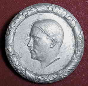 Nazi Adolf Hitler WHW 1935-36 "Tinnie" Badge. This is an extremely fine solid aluminum badge featuring Hitler's profile on the obverse side, and the WHW (Winterhilfswerk) 1935-36 identification along with maker's markings and a horizontal mounting pin on the reverse side. The badge measures about 1 3/16 inches in diameter...$35. SOLD