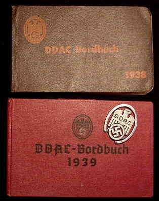 Nazi-era DDAC 1938 and 1939 Log Books and Metal DDAC Emblem. This set includes two extremely fine log books for a member of the Nazi-era German automobile association (DDAC), along with a chromed metal DDAC emblem. The emblem measures about 1 3/4 inches high and is missing part of the oval border section...$65 set. SOLD