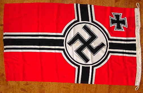 Nazi Water Sports Vessel Flag with Halyard Cord. This is a “salty” original colorful printed flag that shows some mothing and a tear by the halyard sleeve (see photos above). This flag measures about 18” x 32” and is an ideal size for display with your Kriegsmarine collection. This flag comes with its halyard cord with end loop…$165. SOLD