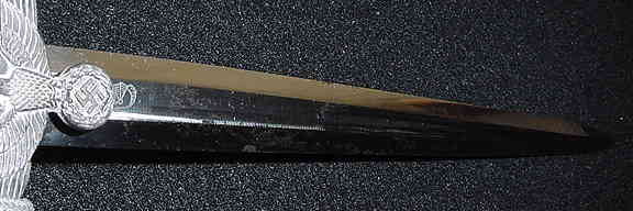 Nazi Fireman’s Dress Bayonet. This is an outstanding near excellent example with a gleaming chromed 9 3/4” unmarked steel blade still having the original leather blade washer present. Both black checkered grip panels rate excellent. Lovely chromed pommel and crossguard. The undented steel scabbard retains about 97% of its original glossy black paint finish. A superb example. Our price…$135. SOLD